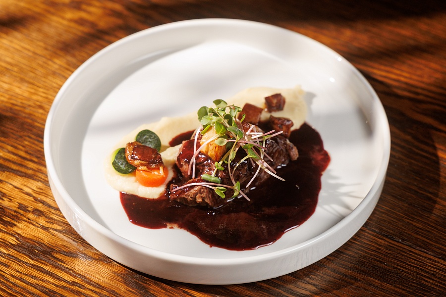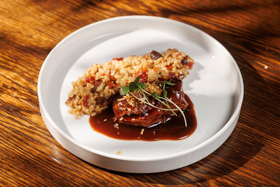 Воронежская говяжья щека с кореньями и воронежской жимолостью
