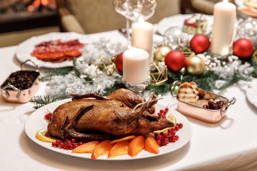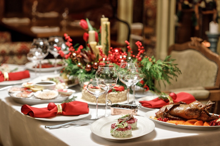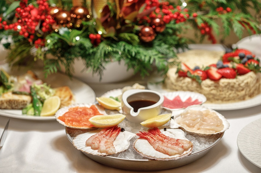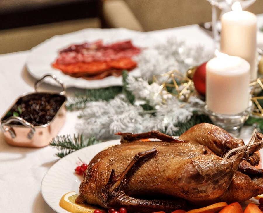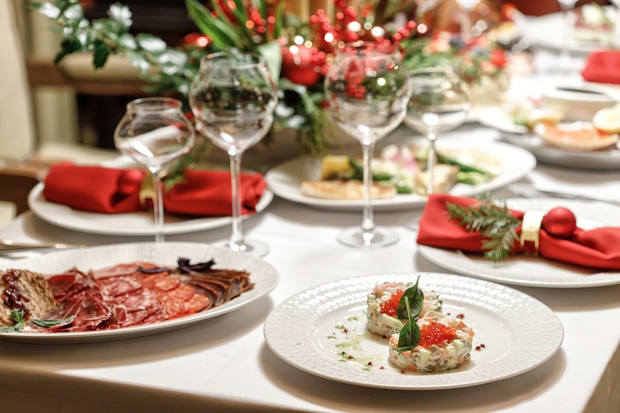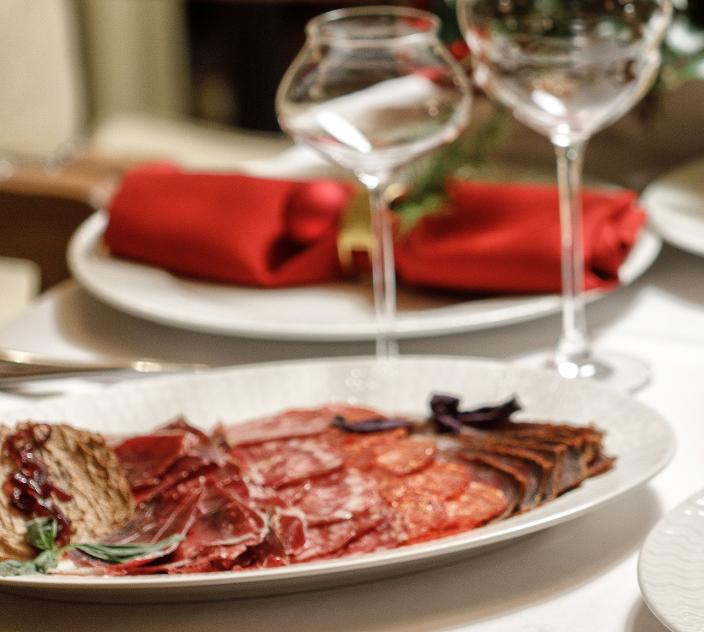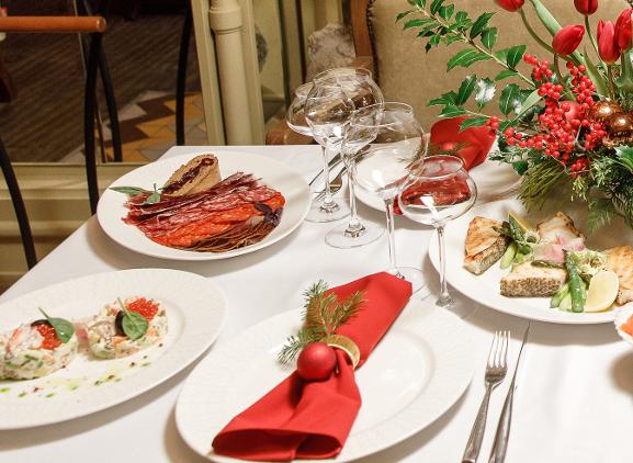 Сашими сет ( шотландский лосось, сахалинский гребешок, сладкая северная креветка, голубой тунец) Мясное плато (Чоризо, Сальчичон, вяленая мраморная говядина, домашний паштет из печени индейки, хамон) Салат оливье с камчатским крабом Среднеземноморские анчоусы под шубой Запеченый осетр Утка запечённая, фаршированная хурмой Тот самый домашний наполеон