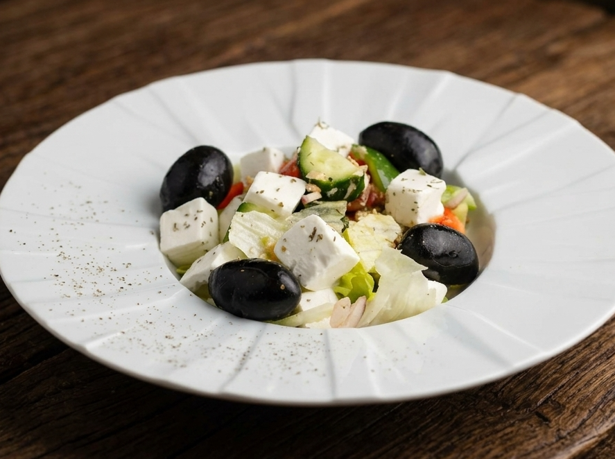 Свежие овощи с козьим сыром, оливками, маслинами и классической греческой заправкой.