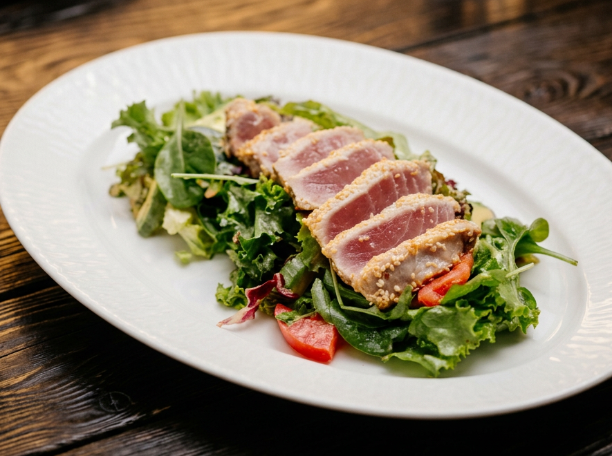 Листья салата с бакинскими помидорами, фермерскими огурчиками, спелым авокадо и красным тунцом, в панированном в семенах кунжута и обжаренным на фермерском оливковом масле. Заправляется ореховым соусом Гамадари