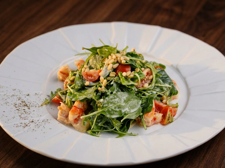 Сахалинский морской гребешок и тигровые креветки, обжаренные на оливковом масле, томленные в белом вине и сливках, с добавлением каперсов. Подаются с листьями рукколы, шпината и помидоров черри заправленных соусом от Шефа и кедровыми орешками