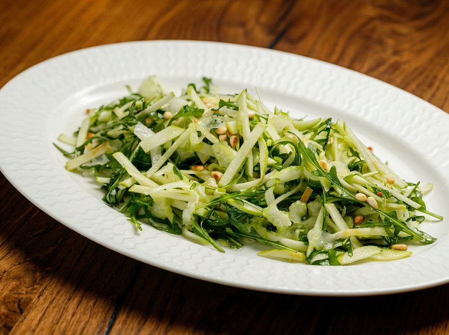 Листья салатов руккола, шпинат и романо, в сочетании с зеленым яблоком, спелым авокадо, соевыми бобами эдамамэ, цуккини. Заправляется азиатскими соусами с растительным маслом.
