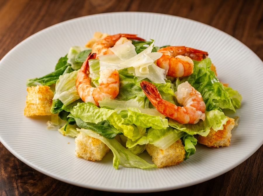 Листья салатов Романо и Айсберг, с королевскими креветками, крутонами, соусом Цезарь и сыром Пармезан