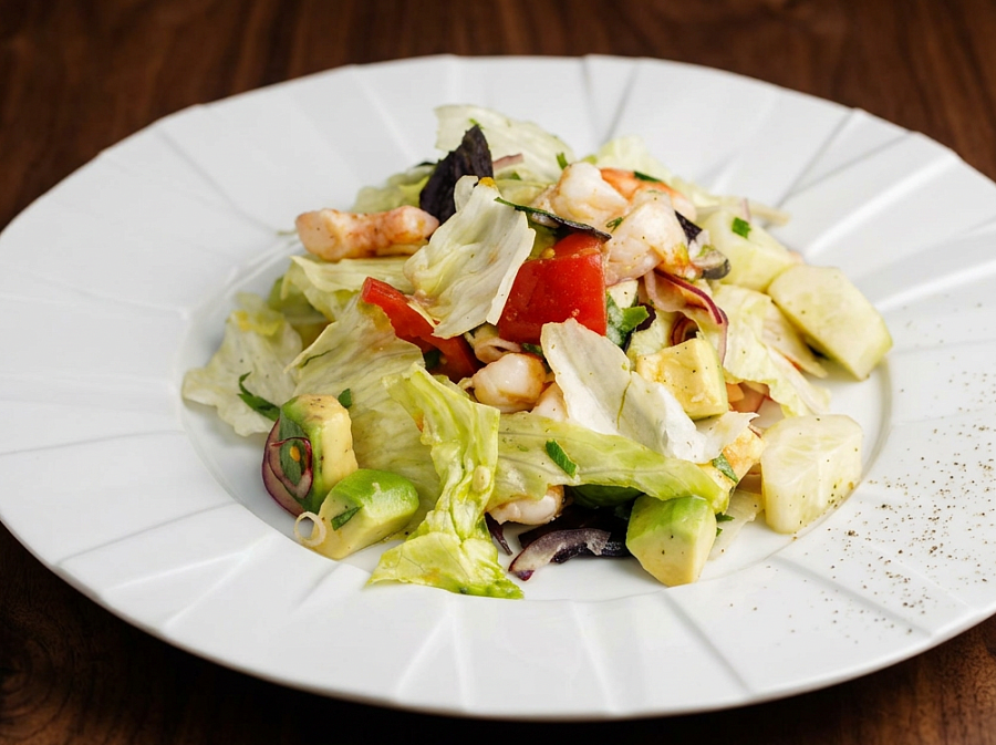 Овощной салат из авокадо, огурца, лука, свежих Бакинских томатов, листьев салата Айсберг и сочных тигровых креветок.Заправлен греческим оливковым маслом с добавлением лимонного сока и хересного уксуса