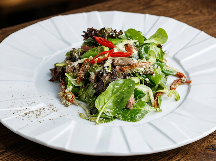 Листья салатов с мраморной вырезкой, обжаренной на гриле, вялеными итальянскими томатами, заправленный соусом песто из рукколы и сыром Риккота